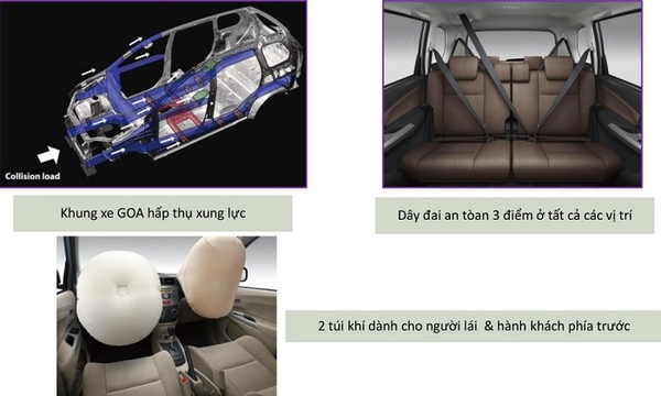 Avanza đươc trang bị khung xe GOA nổi tiếng cùng 2 túi khí cho hành khách phía trước kết hợp với dây đai an toàn cho tất cả các hàng ghế.